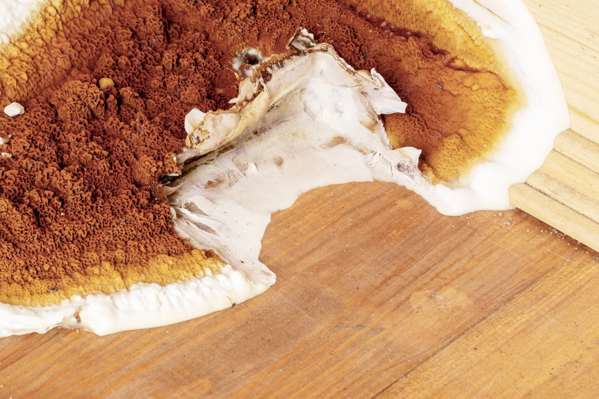Apprenez à reconnaître les premiers signes de la mérule : odeur de champignon, bois qui s'effrite, taches cotonneuses.